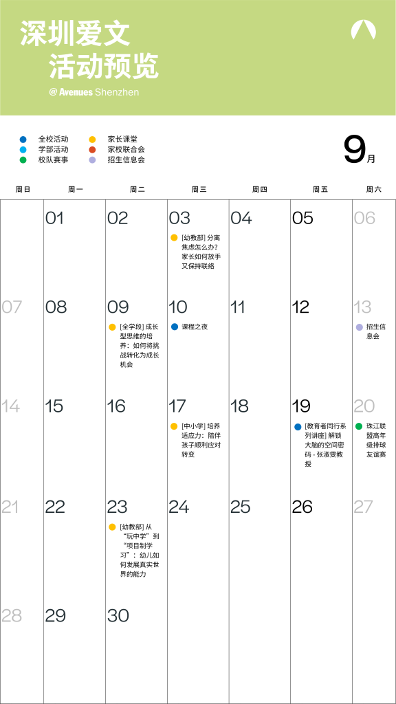 为了方便家长及时了解学校及各学部即将开展的重要活动,我们将在每月初的周报中附上当月活动月历。建议您下载或截图保存以备参考。