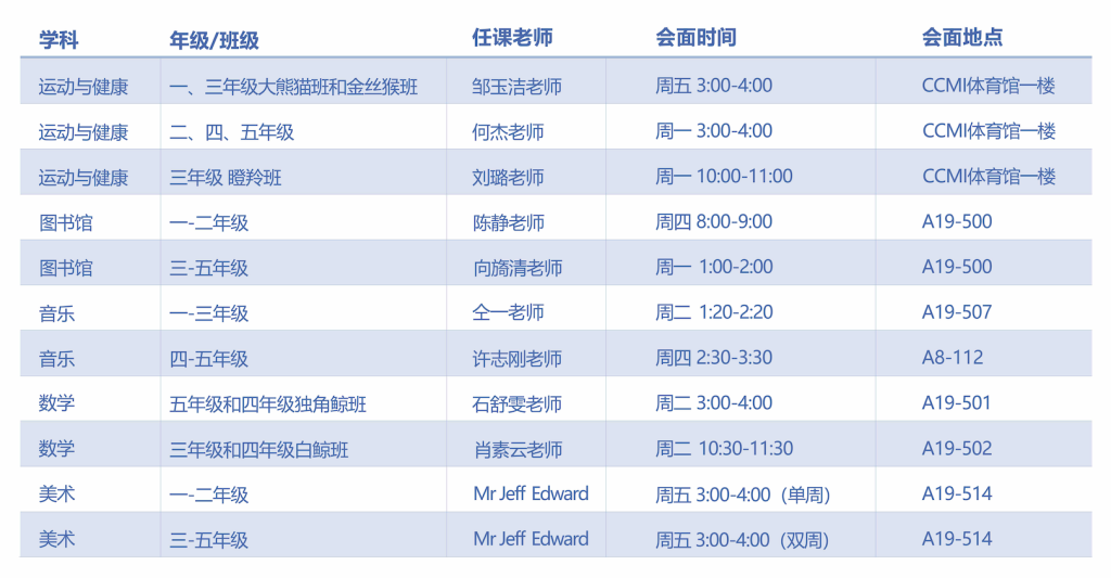 为加强家庭与特色课老师之间的联系,小学部特别开放特色课老师会面时间。您可以预约一周内合适的时间,并在此期间与特色课老师共同讨论您孩子的成长与进步。