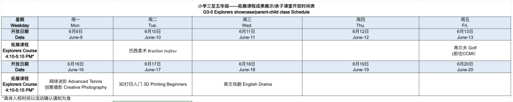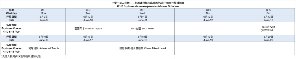 在本学期的拓展程课程中,孩子们在感兴趣的领域充分探索,度过了精彩充实的课后时光。为共同见证他们的成长与收获,我们将开放部分课程,邀请家长入校参与亲子课堂或观看成果展示。您可参考下方日期,参与各课程的期末展示,亲身感受孩子们的探索过程。